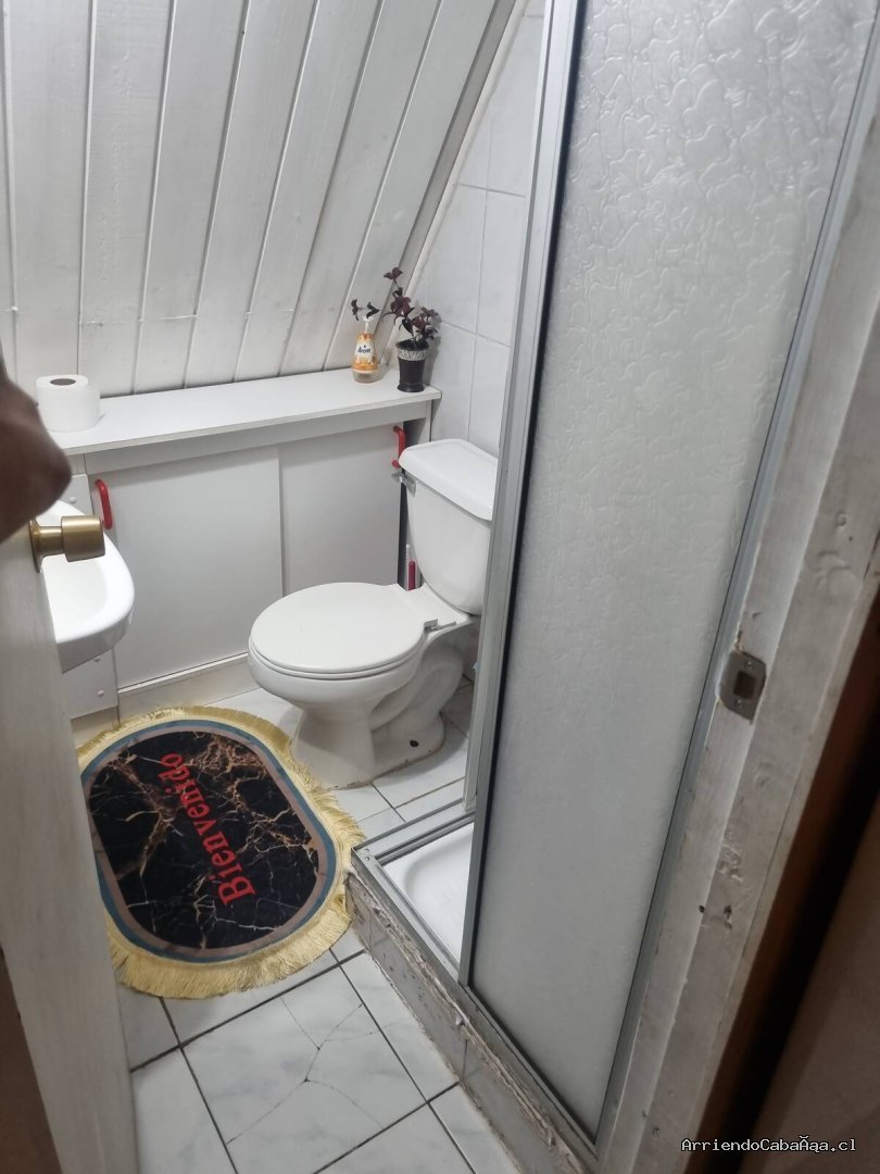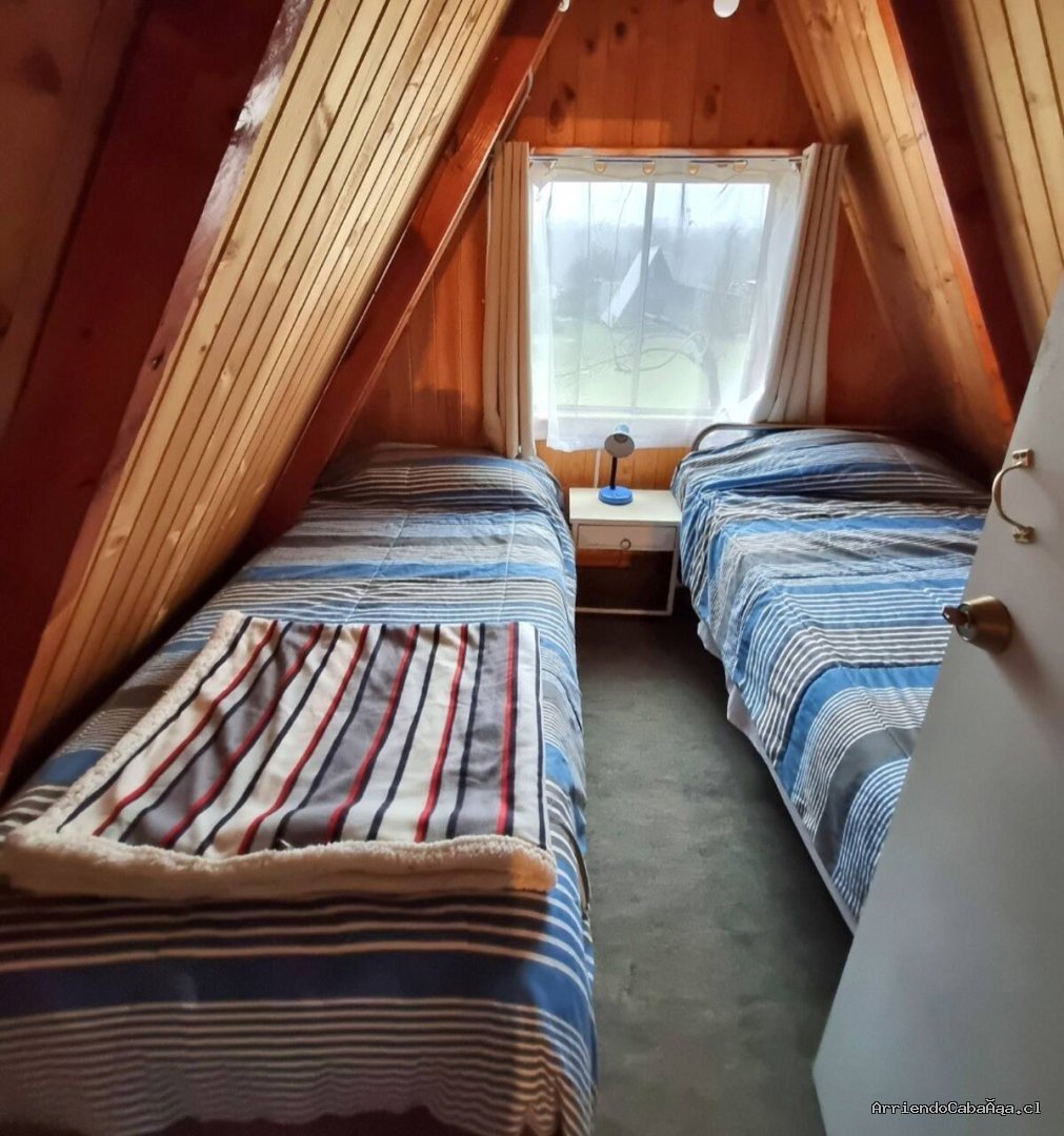 La cabaña cuenta con tres habitaciones. En el primer nivel cama matrimonial de 2 plazas. Baño privado, ducha, con agua caliente de calefont.